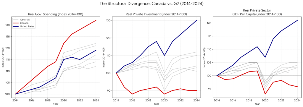 Compared to any other G7 country, Canada has had a more substantial increase in government spending, decline in private sector investment, and contraction in economic activity per capita not directly from government expenditures.